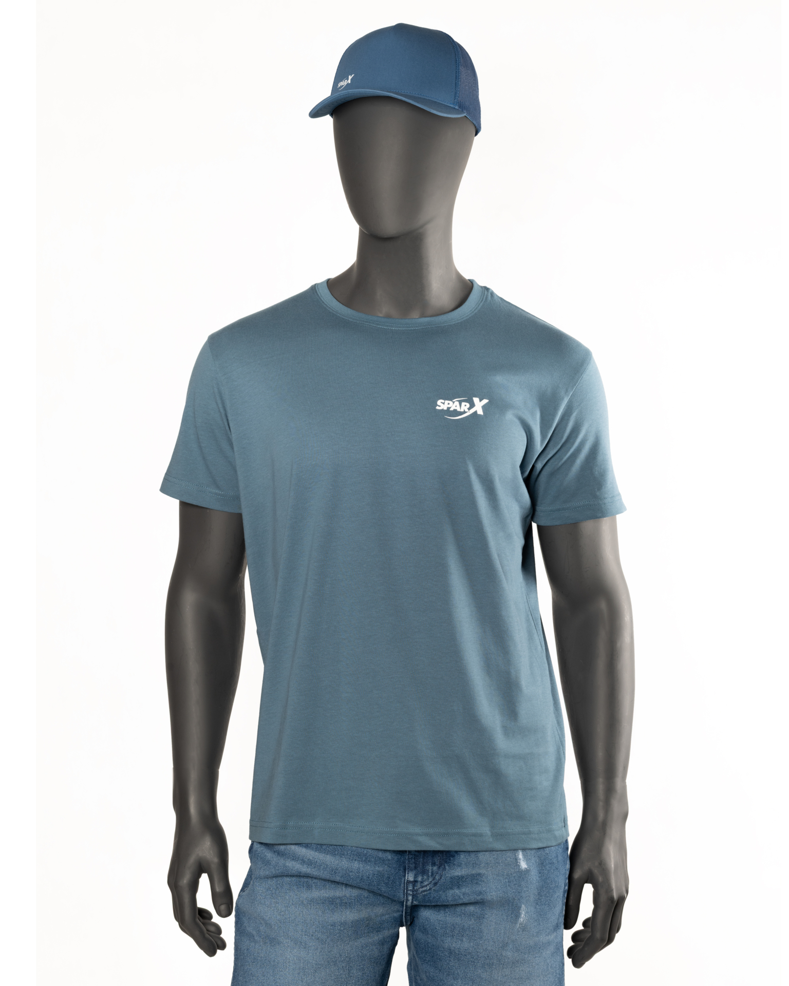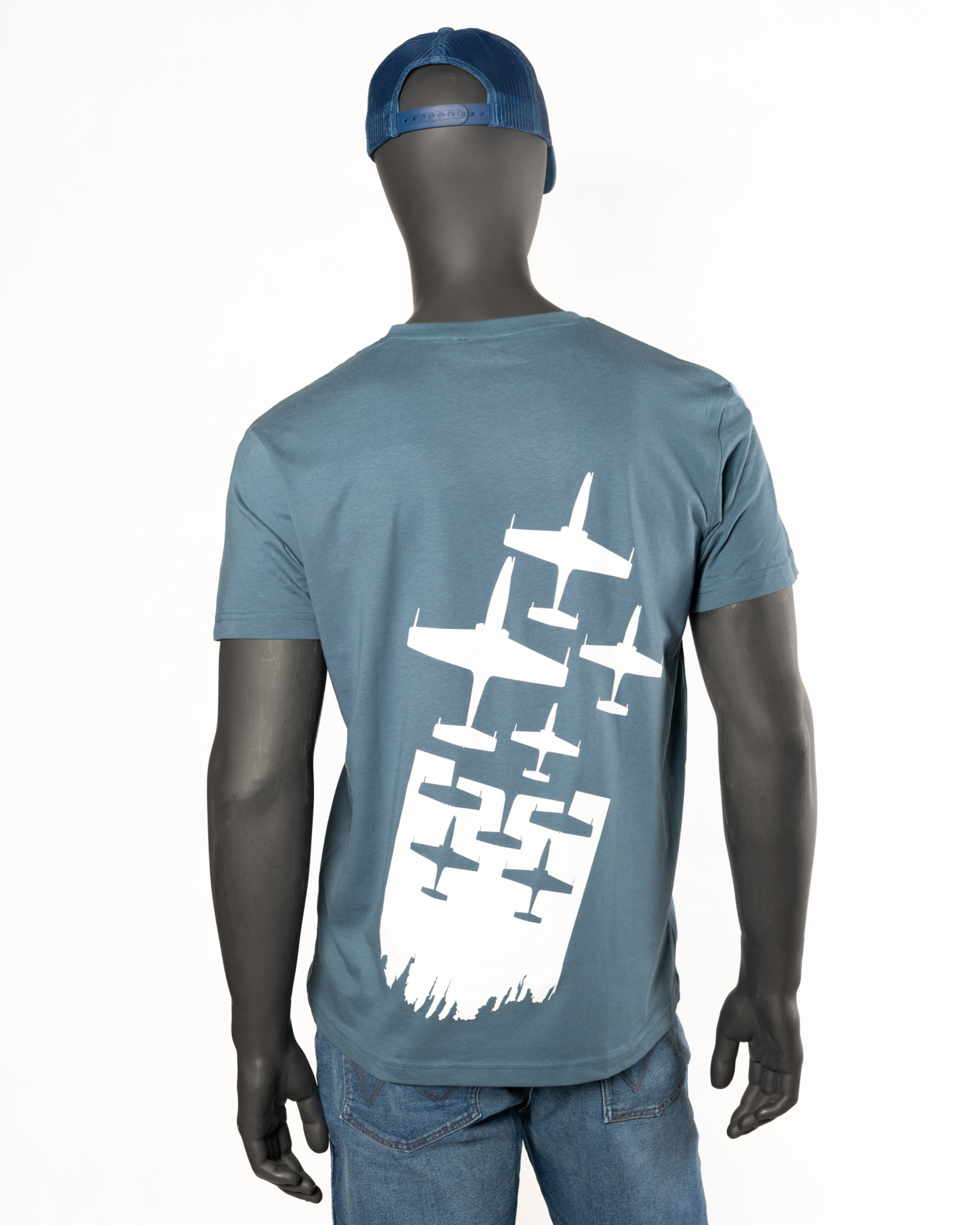 Koszulka z kolekcji POLISH SPARX w kolorze niebieski denim z białym logo na piersi oraz białą grafiką samolotów TS11 Iskra na plecach.